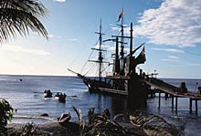 Das Abenteuerliche an dieser Geschichte ist, dass der FLUCH DER KARIBIK nicht wirklich vom Piratenfilm der Fünfziger inspiriert ist, sondern vom gleichnamigen Disney-Vergnügungspark in Florida, er hat also mehr von einer Geisterbahnfahrt als von einem waschechten Genrefilm. Was das Vergnügen natürlich nicht an dem Spektakel, aber fürs filmhistorische Gutachten nicht ganz unwichtig. Die Aufschneiderei gehört primär zum Piraten- wie zum Regiehandwerk: «Kommt näher, meine Freunde, kommt näher», hat bereits Burt Lancaster als Vallo gelockt, der «Rote Korsar» im gleichnamigen Klassiker: «Ihr seid zur letzten Fahrt des roten Korsaren geshanghait worden ... Auf einem Piratenschiff in Piratengewässern und in einer Piratenwelt! Stellt keine Fragen! Glaubt nur, was ihr seht! Nein, glaubt nicht mal die Hälfte davon!» Kommt näher, meine Freunde ... Johnny Depp ist Jack Sparrow, ein aufgedonnerter, unberechenbarer, aber auch trödeliger Kapitän, der auf der Suche ist nach seinem verlorenen Schiff, der Black Pearl. In Port Royal macht er Zwischenstation und rettet das Gouverneurstöchterchen (Keira Knightley) vor dem Ertrinken. Sie war ins Wasser geplumpst, weil ein Mieder ihr die Luft abschnürte. Was darüberhinaus die sehnsüchtigen Phantasien übers Piratenleben, die sie seit der Kindheit erregen, bei diesem «Fehltritt» beigetragen haben, muss jeder Zuschauer für sich entscheiden.