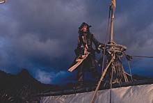 Der Film präsentiert sich jedenfalls als eine Art Kleinmädchenphantasie - die dann eines Abends plötzlich wirklich vor der Erfüllung steht, auf einer einsamen Insel mit Jack und ein paar Fässern Rum, was aber dann doch nur zu einem Ersatzrausch führt. Erst muss Jack seine Rache befriedigen, an seiner einstigen Crew und an seinem Maat - Geoffrey Rush als Barbarossa -, der ihm im Handstreich das Schiff stahl und sich auf die Jagd machte nach einer Kiste mit Aztekengold, auf der ein grausiger Fluch lag. Das ist ein Moment von Verrat am Genre, dass der Film die Piraten als Zombies präsentiert, als Untote, ohne Bezug zur wirklichen Welt. Die Sinnlichkeit war dem Genre elementar, so scheint es auch Barbarossa zu empfinden: »Ich fühle nichts mehr«, beschreibt er Elizabeth seine Situation, »nicht den Wind auf der Haut, die Tropfen der Gischt ... die Berührung einer fremden Haut.«, Visuell ist der Film bestens drauf, wie mit einem Kajalstift sind die Konturen gezogen, die Himmel strahlen, und das Meer funkelt, die Männer- und Frauenaugen blitzen. «Furchtlos» heißt das Schiff, das stolz durch den Film segelt, und das bezieht sich immer auch aufs Sexuelle. Eine direkte Verbindung gibt es dann doch zum klassischen Genre: Bob Anderson, einer der Schwertmeister, der Johnny Depp und Orlando Bloom instruiert hat, hat einst Errol Flynn gedoubelt, 1953, beim MASTER OF BALLANTREE - der zwar nur ein Drittel-Piratenfilm ist, aber, eine weitere grandiose Connection, auf einem Stevenson-Roman basiert. Was dem Film freilich fehlt, ist die klassische Eleganz, der Rhythmus. Das Genrekino war ein Kind des alten Studiosystems, geboren aus der Notwendigkeit, die reichen Studioressourcen auch neben und zwischen den Großproduktionen zu nutzen, durch eine unaufhörliche Kleinproduktion. Es ist dieser Reichtum, den das arme, aber unerschöpfliche Genrekino paradoxerweise immer feiert - und wer könnte dies besser als der Pirat, der sich außerhalb gesellschaftlicher Produktionsprozesse bewegt, abseits von produktiver Arbeit und Ideologie. Der Pirat karnevalisiert sich selbst, war vor dreißig Jahren in dem klassischen Filmkritik-Heft zum Piratenfilm zu lesen, und der Piratenfilm und das Musical sind das Traumkino par excellence. Man muss auch wirklich an Astaire denken bei der schwebenden Bewegung, wenn Johnny Depp auf seinem sinkenden Boot an die Mole von Port Royal ransteuert und im letzten Moment, bevor das Schiff versunken ist, von der Spitze des Mastes sich abstoßend das Land erreicht. Mit Kopftuch und Rasta-Zotteln, mit Gold an den Zähnen und an den Fingern, mit seiner traurigen, trancehaften, auch effeminierten Aura ist Sparrow der große Antiheld des Sommers gewesen, das Gegenstück zum ordentlichen Orlando Bloom, der Waffenschmied, der Handwerker. Erotik ist im Spiel, wenn die zwei sich zusammentun, um das Mädchen zu retten, die Klingen ihrer Schwerter streifen sich zärtlich, bevor sie sich ein kleines freundschaftliches Duell in der Schmiede liefern. Das Gesunde und das Kranke, das Normale und das Abartige, der starke und der verfaulende Körper ... »Besser, Sie fangen an, an Geistergeschichten zu glauben. Sie befinden sich nämlich mittendrin in einer« - das ist ein Rat Barbarossas, der auch dem Zuschauer gilt. Regisseur Gore Verbinski aber, der sich hier mit dem notorischen Megaproduzenten Jerry Bruckheimer eingelassen hat, kann gut grienen. Er ist sich treu geblieben, hat nach der Liebe-auf-der-Flucht-Komödie THE MEXICAN mit Julia Roberts/Brad Pitt und dem Horrorstück THE RING nun seinen dritten Phantomfilm vorgelegt. Das ist, heißt es mal im Film, entweder Brillanz oder reiner Wahnsinn.